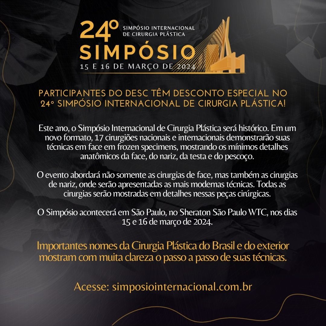 O Simpósio Internacional de Cirurgia Plástica já está com sua Programação Científica pronta para acontecer nos dias 15 e 16 de março de 2024. Agora na sua 24ª Edição, trazendo 17 Professores Nacionais e Internacionais de reconhecida experiência, com uma grande novidade: demonstrações cirúrgicas de face em frozen specimens, mostrando os mínimos detalhes anatômicos da face, do nariz, da testa e do pescoço. As demonstrações serão realizadas no laboratório do Hospital Oswaldo Cruz, com transmissão direta em Full HD para o auditório do Sheraton Hotel. As vagas presenciais no laboratório e no auditório serão limitadas, e as inscrições poderão ser realizadas pelo site.