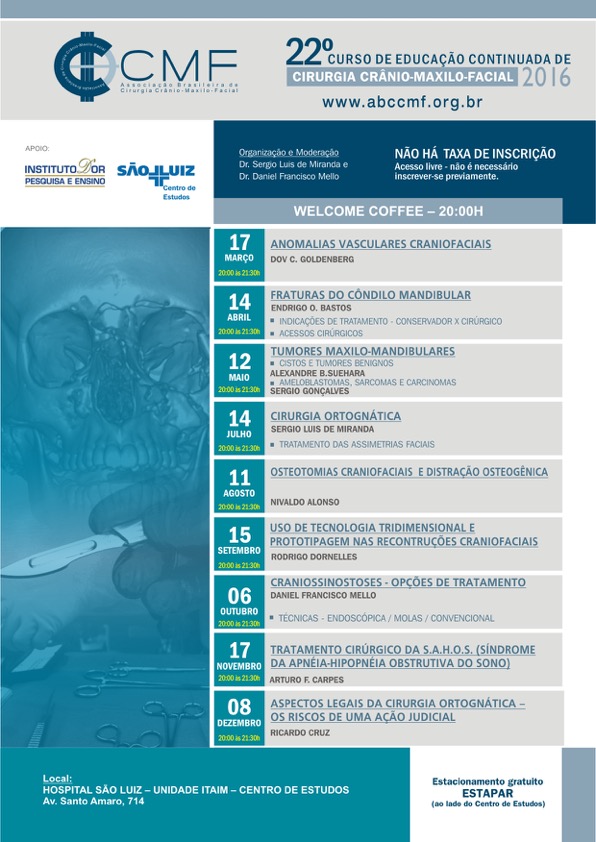 22o. Curso de Educação Continuada de Cirurgia Crânio-Maxilo-Facial 2016 Organização e moderação: Dr. Sergio Luis de Miranda Dr. Daniel Francisco Mello Não há taxa de inscrição. 22o. Curso de Educação Continuada de Cirurgia Crânio-Maxilo-Facial 2016