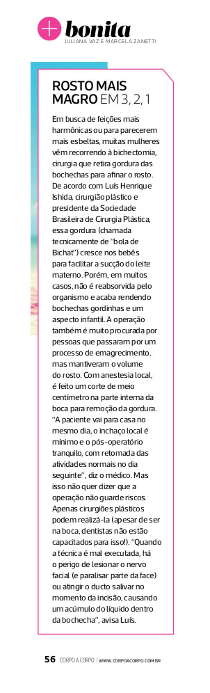 Matéria publicada na revista Corpo a Corpo, caderno Mais-Bonita, edição de setembro de 2016. Muitas mulheres vêm recorrendo à bichectomia, cirurgia que retira gordura das bochechas para afinar o rosto. Clique na imagem para ampliar.