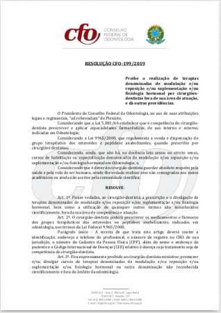 Além disso, no último dia 29 de janeiro, o CFO anunciou a resolução 199/2019, em que proíbe dentistas de realizarem terapias de modulação, reposição ou suplementação hormonal, visto que “não há, na docência lato sensu ou stricto sensu, cursos de habilitação ou especialização denominados de modulação e/ou reposição e/ou suplementação e/ou fisiologia hormonal em Odontologia”.